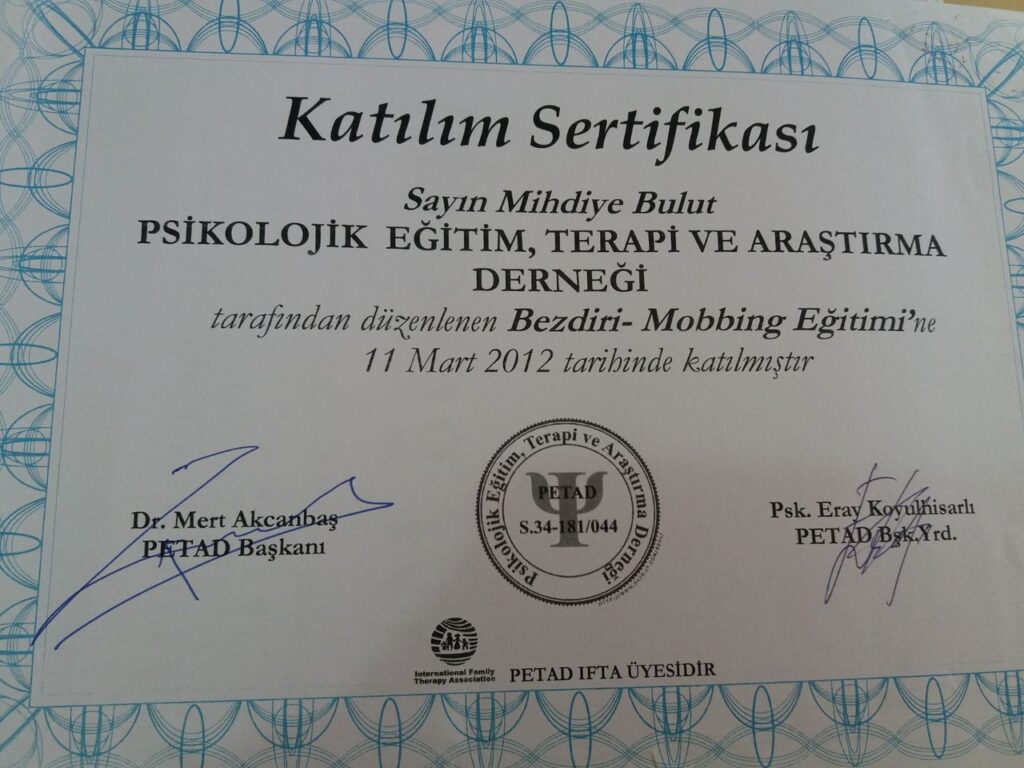Ben Mihdiye Bulut, Uzman Klinik Psikolog olarak uzun yıllardır bireysel, çift, aile ve kurumsal danışmanlık alanlarında çalışmaktayım. Psikoloji lisans eğitimimi İstanbul Fen-Edebiyat Fakültesi Psikoloji Bölümü’nde %100 İngilizce programla tamamladım. Ardından, Hasan Kalyoncu Üniversitesi Sosyal Bilimler Enstitüsü Klinik Psikoloji Ana Bilim Dalı’nda yüksek lisans eğitimimi bitirerek “Klinik Psikolog” unvanını aldım.